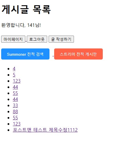 비로그인시에는 이러한것들이 안보이고 로그인 유도글을 넣었습니다. 밑에는 이제 이전에 만들었던 전적검색기능과 스트리머 전적게시판으로 이동할 버튼을 만들었고 밑에는 게시글들을 보여주는 간단하지만 구현한 기능들을 전부 보여주도록 하였습니다.